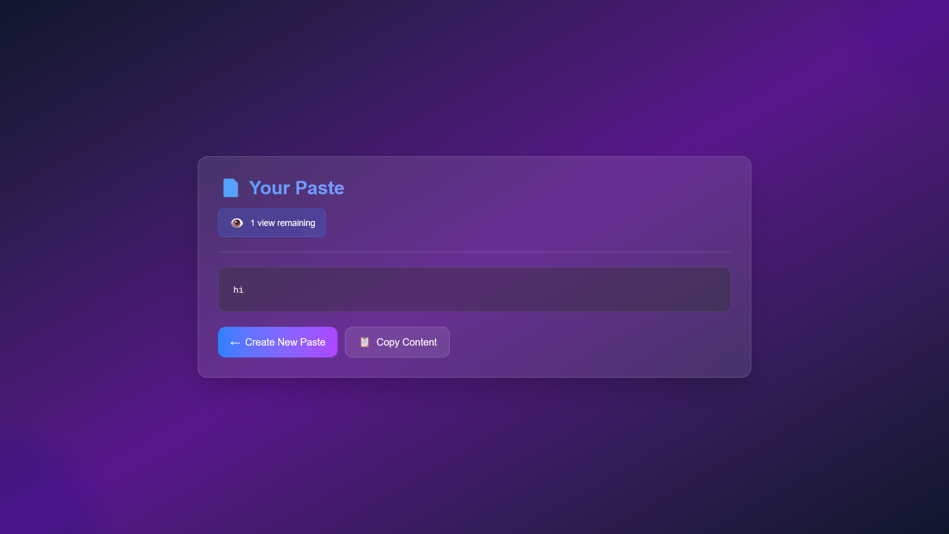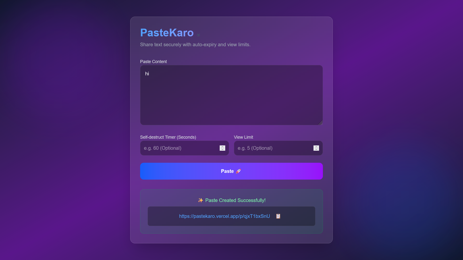 PasteKaro Secure text-sharing web application PasteKaro is a full stack web application that allows users to securely share text or code snippets with time-based and view-based expiration. It is designed for developers and users who want to share sensitive information temporarily without long-term storage. I built PasteKaro end to end, handling everything from UI and UX to backend APIs, authentication, and database design. The application focuses on simplicity, security, and performance, while handling real-world edge cases like expiry validation, access limits, and misuse prevention. Key Features: Create temporary text pastes with expiry time or view limits Secure access and controlled visibility Clean, responsive UI for fast sharing Backend APIs for paste creation, retrieval, and auto-expiry Database design optimized for short-lived data Deployed and tested as a real, usable product What I learned: Designing end-to-end product flows Writing clean APIs and database logic Handling edge cases and production-level debugging Thinking in terms of user experience and security, not just code